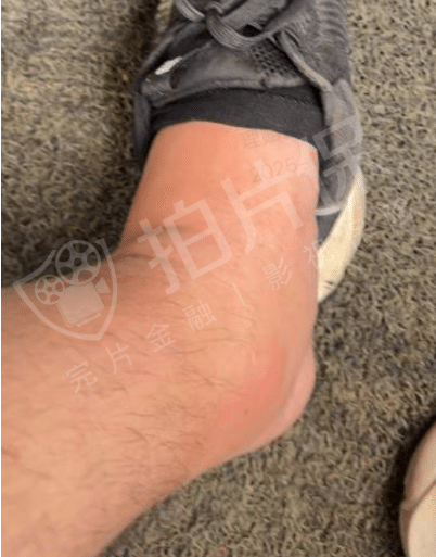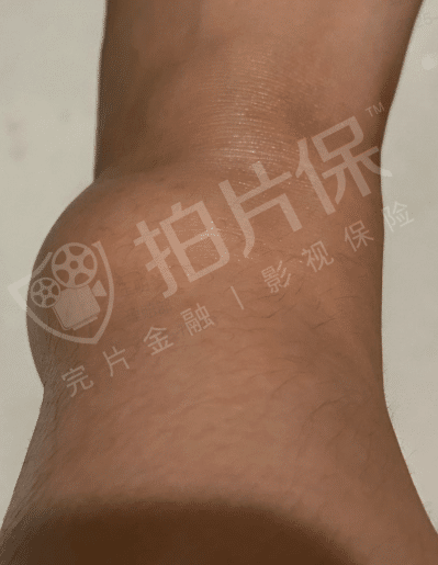 案例二,某剧组工作人员在收工回酒店时,因下雨导致地面湿滑,上服装车收纳衣服时崴到脚踝,软组织受伤。
