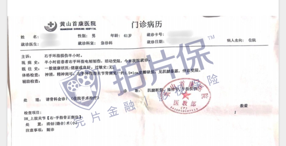 几个月前,某古装剧剧组道具师在影视基地加工木材道具时,不慎导致右手环指被电刨刨伤,并第一时间前往当地二级以上公立医院就医。经诊断,该道具师右环指伸指肌腱断裂、右上肢皮肤缺损、右环指开放性指骨骨折,遂接受了手术治疗。