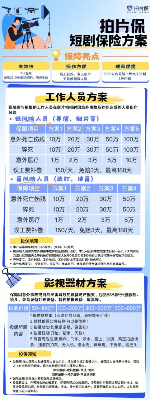 随着短剧行业进入高速发展期,为精准匹配短剧拍摄的独特需求,解决传统影视保险“保费高、免赔额高、适配性弱”的问题,我司经过深度调研与产品迭代,正式升级【短剧拍摄专属保险方案】,从器材保障到人员安全,提供更具针对性、高性价比的全方位保障支持!